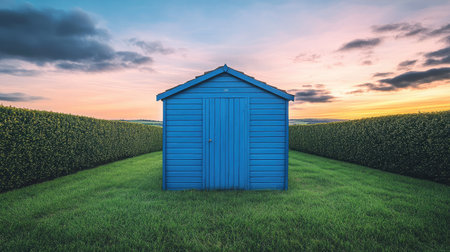 Neatly placed garden storage shed on a lush green lawn with a glowing sunset sky and trimmed hedges