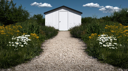 A gravel path leads to a white shed surrounded by wildflowers.