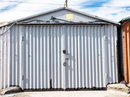 Vertical White puffy clouds Aqua blue detached garage exterior at Oceanside, California. Garage exterior with bi-fold doors against the houses at thee background.