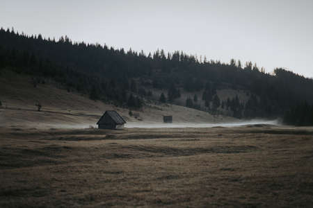 Shot of a lonely cabin in a thin layer of fog after sunset in a transylvanian valley