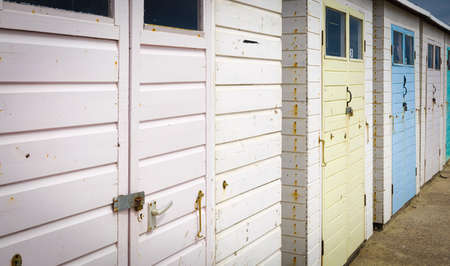 Seaside beach huts on Seaford beach, East Sussex. England, selective focus