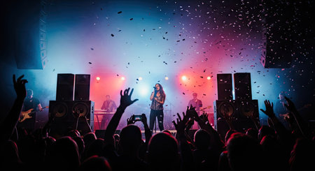 A concert stage showcases a performer singing passionately, illuminated by vibrant stage lighting. Silhouettes of a crowd with raised hands fill the foreground. The composition employs bright colors and dynamic lighting. The image suggests live music events and could be used for promotional or editorial purposes.