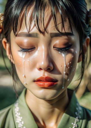 asian woman with a tearful expression, wearing a traditional Japanese kimono