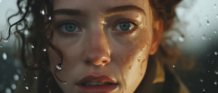 Man face is wet with water droplets. Concept of freshness and cleanliness, as if the woman has just taken a shower or washed her face