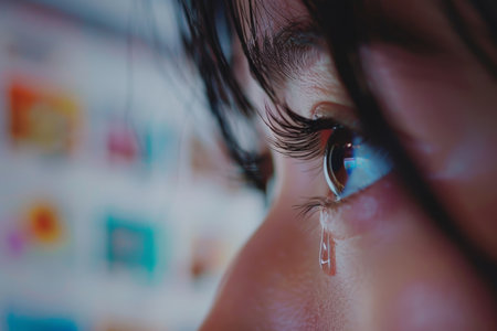 A close-up shot captures a womans eye filled with tears, highlighting the intricate details of her eyelashes and the emotion conveyed through her gaze. The moment reflects sadness and vulnerability.