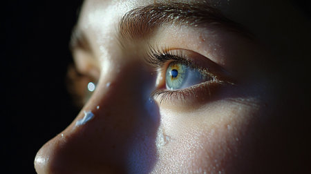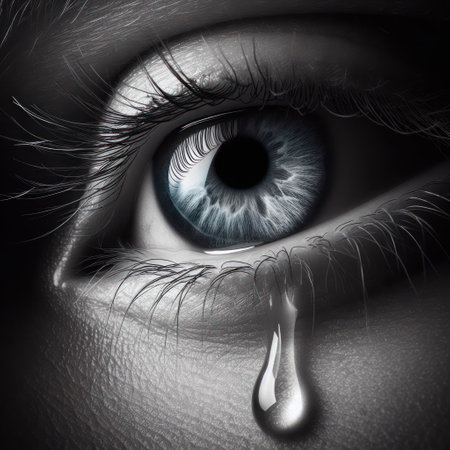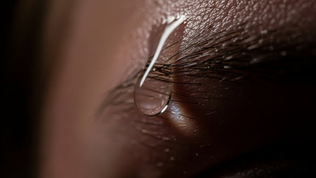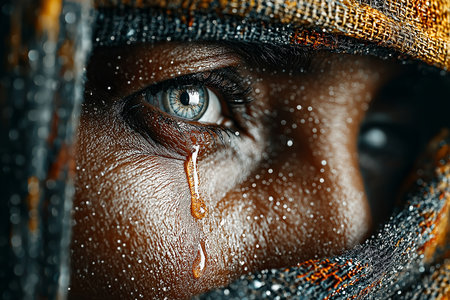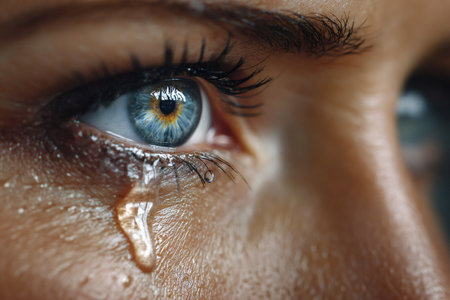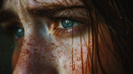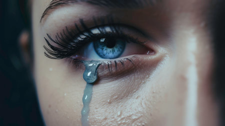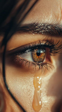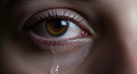 Extreme close-up of a tear rolling down a woman's face, capturing deep emotion and sadness with dramatic lighting and detail.