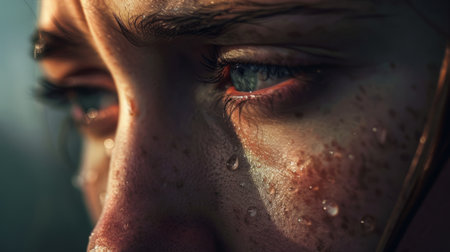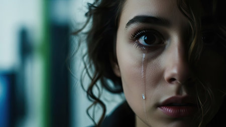 Close-up of a tearful woman, her face showing deep sorrow and vulnerability, tears glistening on her cheeks.