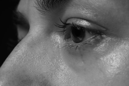 A single tear rolls down a person's face in emotional close-up, representing sadness, grief, and human vulnerability in dark setting.