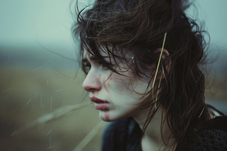This close-up shot portrays a woman with a tear rolling down her cheek, highlighting emotions. The composition emphasizes her face, with soft focus creating depth. The lighting is diffused and cool, suggesting an indoor setting. This image is suitable for various commercial uses related to emotion and storytelling.