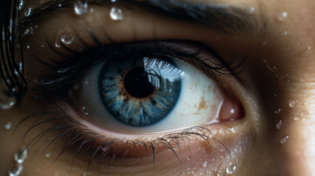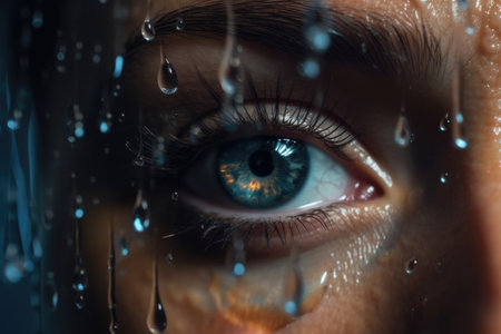 Close-up of human eye with raindrops on the skin, detailed captured macro shot of blue iris and wet face, emotional look, rain concept