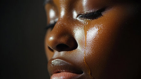 A poignant close-up of a woman face showing tears rolling down, reflecting deep emotions and vulnerability, capturing an intimate moment of raw human experience.