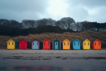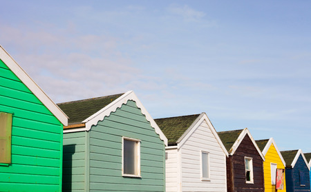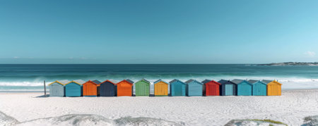 Row of colorful beach huts, sunny day, coastal scene