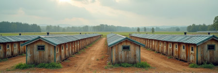 Symmetrical farm landscape with rustic barns under cloudy sky in countryside. That the image is generated using AI.