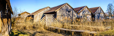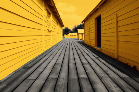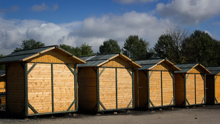 Outdoor closed yellow wooden stalls with a blue sky in the background