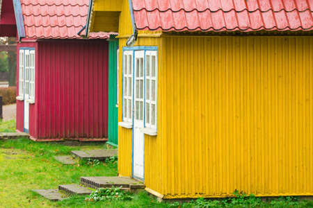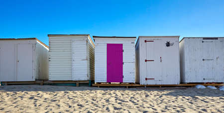 Beach huts coloured doors on wooden sea side huts.sun sea and Sandy beach living by the ocean