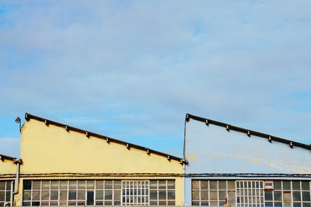 An outdoor view of two triangle metal roofs with a single round window in each one of metro or train depot buildings, outdoor storage facilities, or hangar; clear sky, dark bushes in a foreground