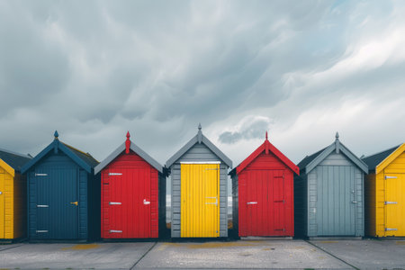 A row of vibrant red, yellow, blue, and gray beach huts stands under a wispy sky, evoking cheerful coastal vibes.
