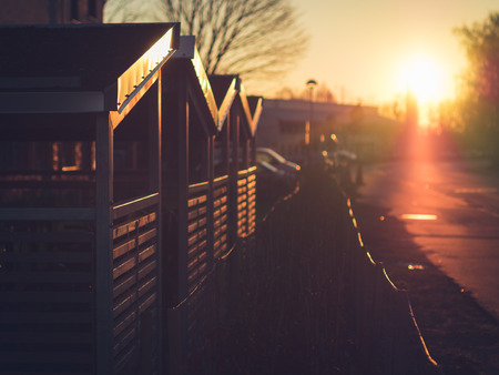 A beautiful sunrise on a street in Lund, Sweden. The morning sun sunrays beautifully hit a couple of bicycle storage sheds. A wonderful world with backlight.