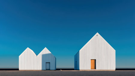 Two minimalist white houses stand side by side against a clear blue sky, showcasing modern architecture and serene surroundings in a tranquil setting.