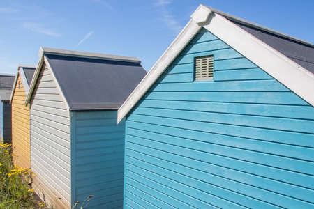 Colourful painted wooden beach huts or sheds. Rear view. Close-up of pretty blue and yellow beach huts with ventilation grill on the UK coast