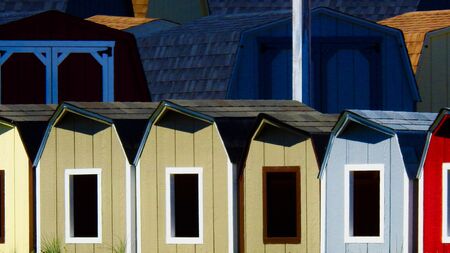A row of brightly colored small garden sheds.
