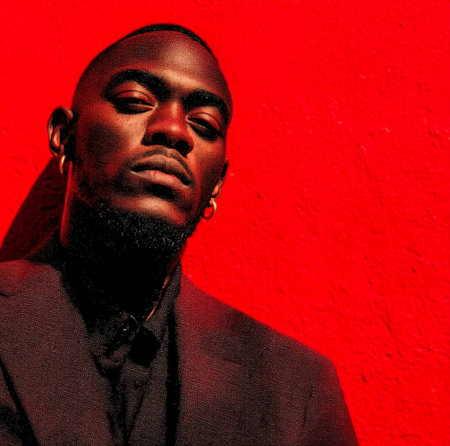 portrait of a young black male on a gray wall background