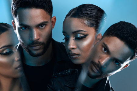 Youll find them in your favourite magazine. Conceptual portrait of a stylish young man and woman posing in studio against a blue background.