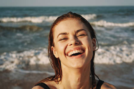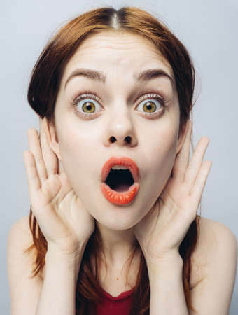 cheerful woman with wide open mouth spread her ears close-up emotions