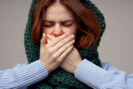 sick woman health problems temperature light background