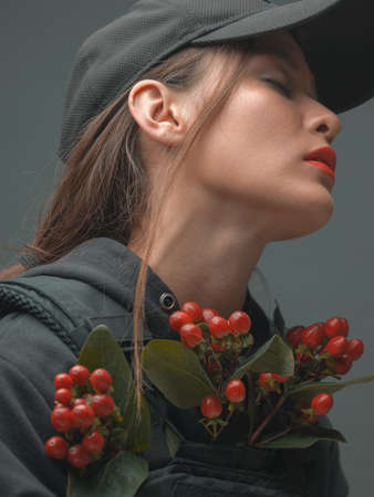 Rebel girl in military style clothing with flowers. Rebellion, revolt, protest, and hippie pacifism. Rose revolution.