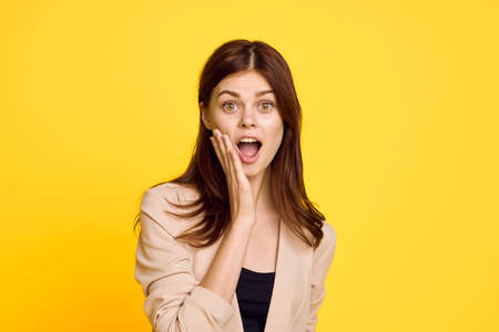 pretty woman posing fashion emotions yellow background