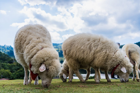 Sheep grazing in a lush green field, with a focus on their thick, woolly coats, emphasizing the natural habitat and wool quality.