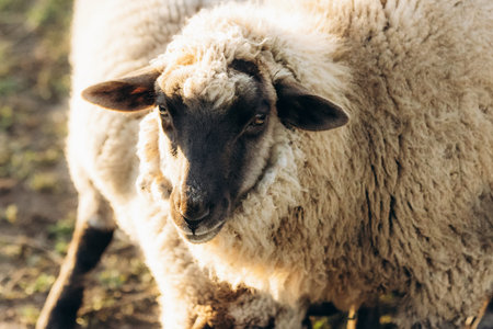Portrait of a sheep in natural lighting, showcasing the animal's woolly coat and attentive expression in an outdoor farm environment.