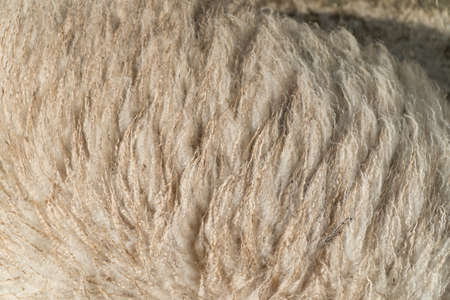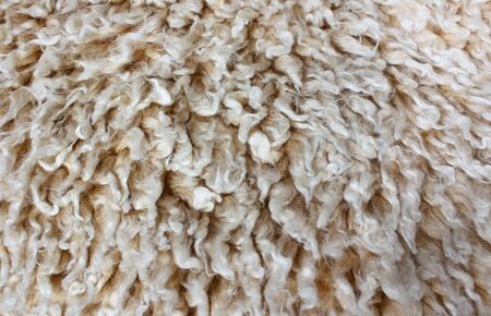 Close up of untreated sheepskin natural beige wool fiber and texture of sheep s hair fabric