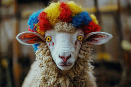 Playful sheep with a colorful fluffy hairstyle, featuring vibrant red, blue, and yellow tones, standing in a rustic farm setting. Joyful and whimsical character.