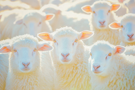 This image showcases a flock of sheep, captured in a close-up perspective. The animals exhibit creamy white wool, highlighted by warm sunlight. The shallow depth of field emphasizes the lead sheep. Suitable for illustrations related to nature, farming, and agricultural themes. It has potential for commercial or editorial applications.