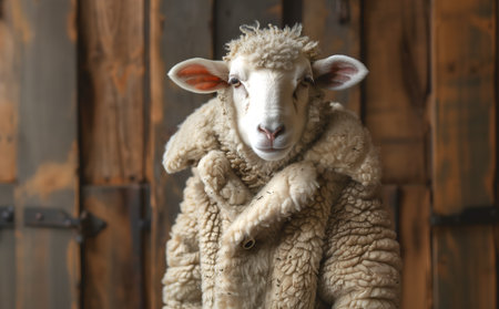 A fluffy sheep wears a fluffy jacket, looking straight at the camera. ai generated