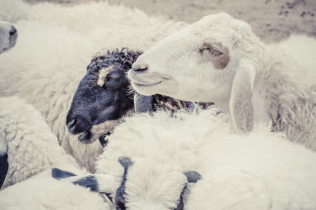 Young white sheep is surrounded by black sheep. Flock of sheep. A white crow, a friend among strangers, a stranger among his own.