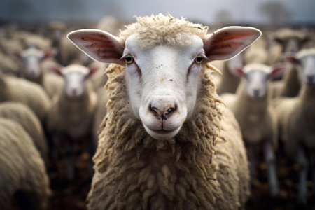 a woman gazes directly into the camera, surrounded by a group of sheep. the photo captures a sense of working-class empathy and showcases the distinct facial features of the woman. the light beige and light amber tones add to the overall aesthetic, while the intense close-up creates an authentic and lighthearted atmosphere. ai generated