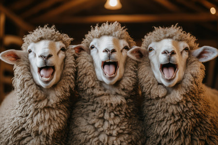 Group of sheep appear to be laughing inside a farm stable. Light-hearted animal humor and rural lifestyle.
