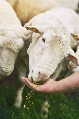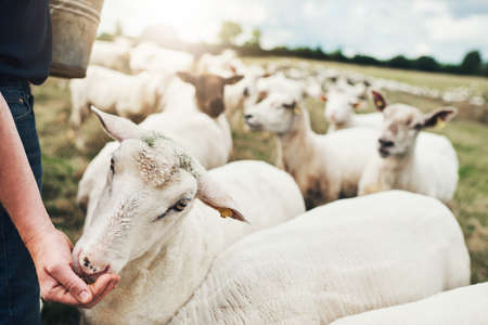 Heres a bit for you. a unrecognizable farmer feeding his sheep with his hand outside on his land during the day.