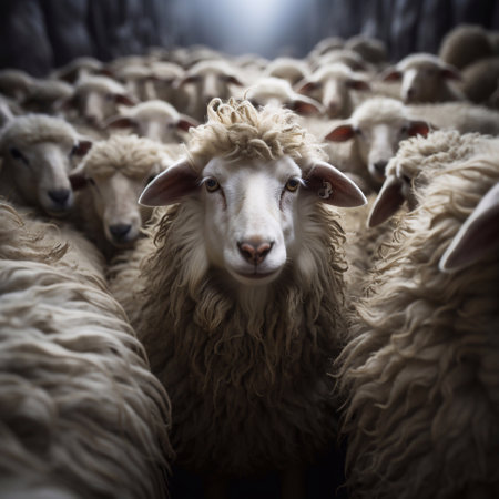 A lone black sheep surrounded by a sea of white sheep, creating a striking contrast that symbolizes nonconformity and being different.