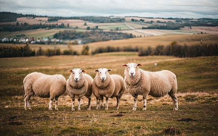 A herd of sheep in a pasture on a sunny day created with Generative AI