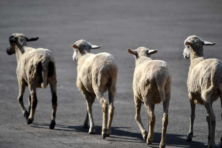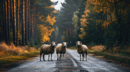 Sheep standing on the road near forest at early morning or evening time. Road hazards, wildlife and transport.