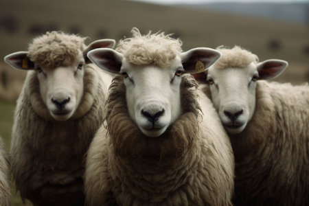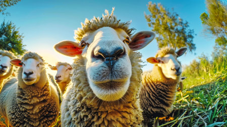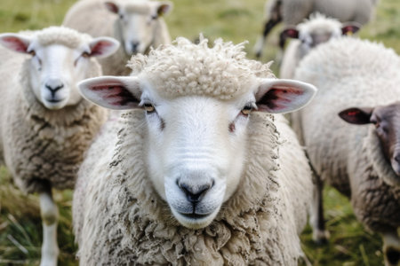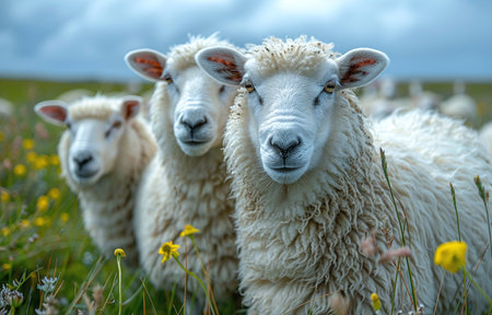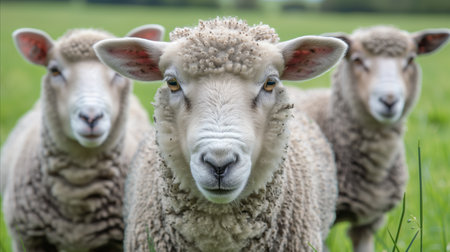 White sheep standing together in a lush green field gazing at the camera, ai-generated