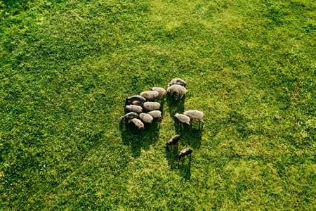 Aerial top down view of grazing sheep flock on green field. Grazing sheep or rams. Beautiful rural landscape with domestic farm animals.