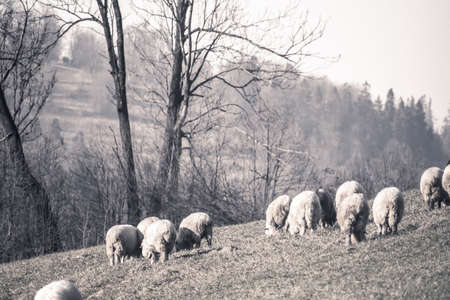 Old picture effect, sheep grazing on a hill. Traditional farming in Podhale region, Poland. The view in Poronin city. Selective focus on the animals, blurred background.