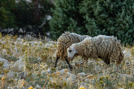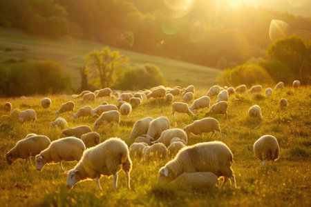 Group of white sheep eating or walking or running at the lawn. In the evening in the mountain meadow. The sun shines on every grass, evening atmosphere. Animal nature mamals concept.