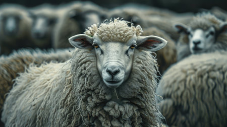 A lone sheep stands apart from the herd, gazing up with a sense of individuality and distinctiveness, evoking the notion of uniqueness and standing out