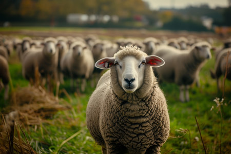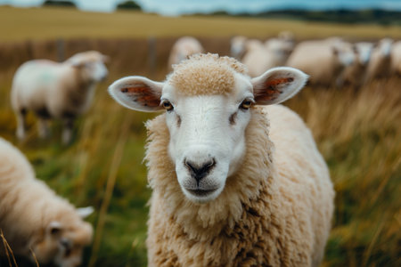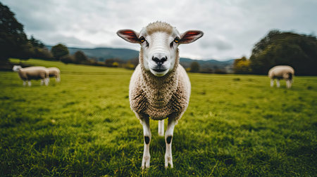 AI Generated. A sheep stands in a lush green field with grazing flock in the background under a cloudy sky